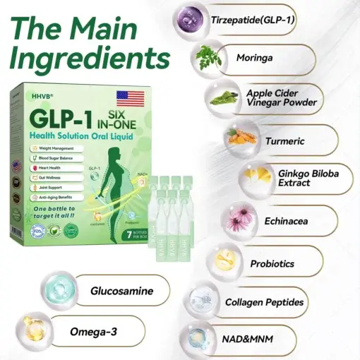 HHVBยฎ GLP-1 SIX IN-ONE Health Solution Oral Liquidย was developed by a team of over 30 experts in international endocrinology and diabetology after more than 3 years of research. It combinesย Meglutideย with powerful herbal ingredients to boost metabolism, accelerate fat burning, and support digestive and lymphatic health. To further support the body during weight loss, the formula also includesย Collagen Peptides, which stimulate the bodyโs collagen synthesis toย enhance skin firmness, improve sagging and fine lines, and help reduce skin laxity caused by rapid weight loss. This oral solution has been approved by the U.S. Food and Drug Administration (FDA) for its safety and efficacy, offering a scientifically backed solution for weight loss and overall wellness.